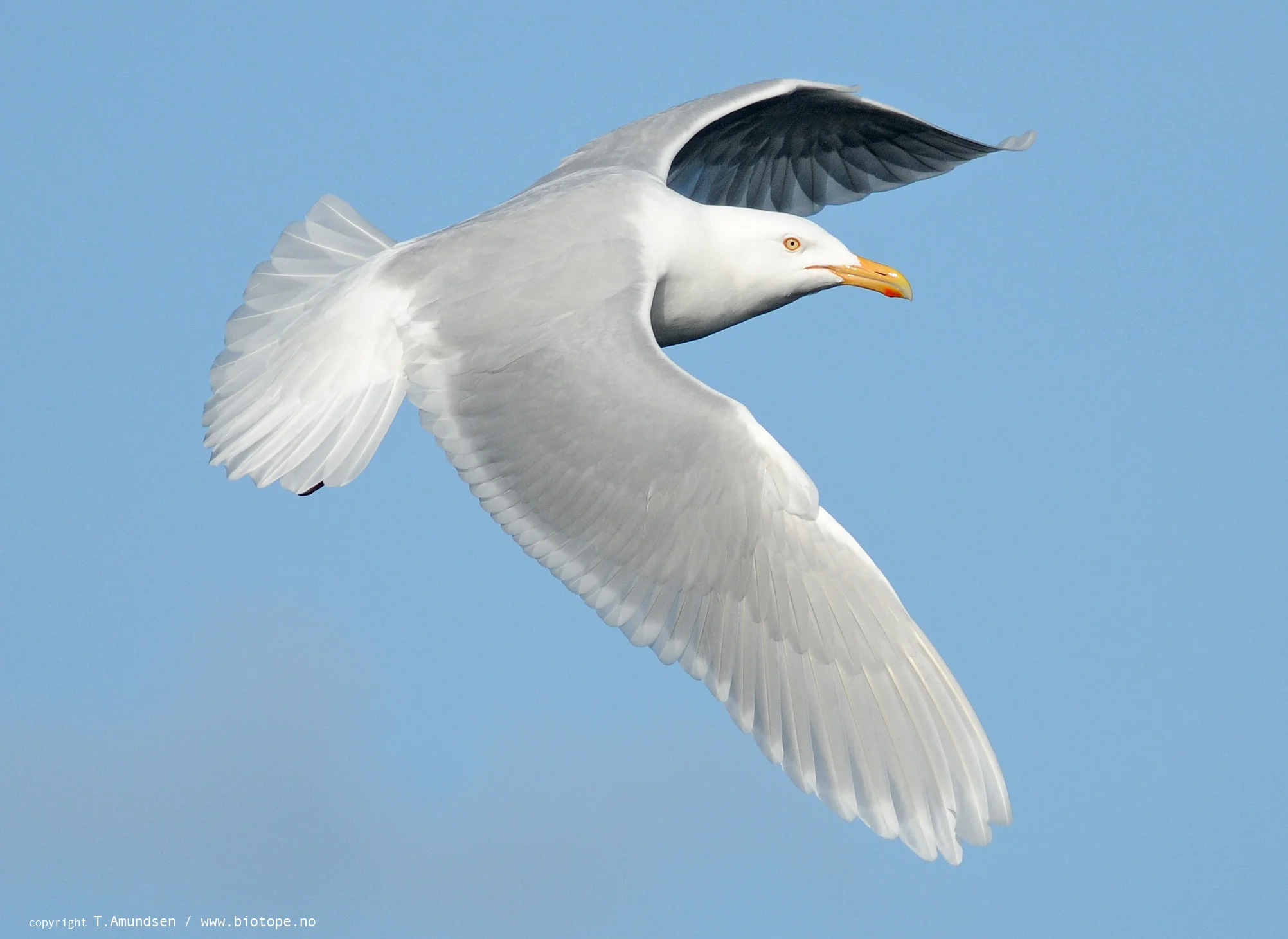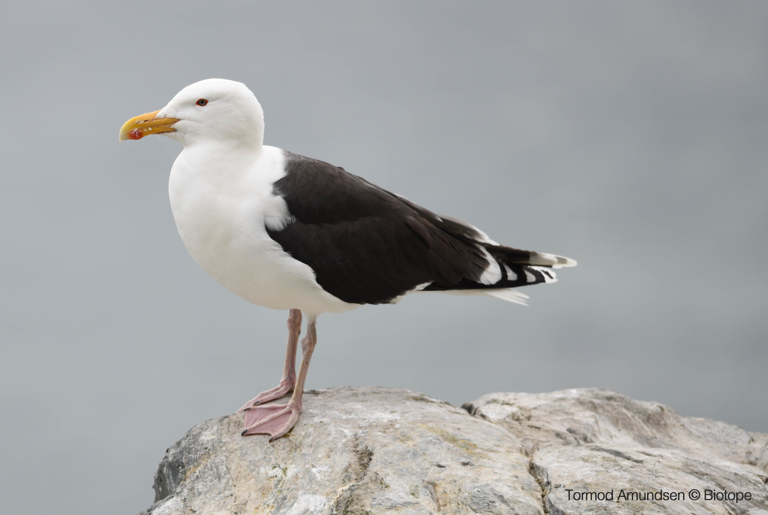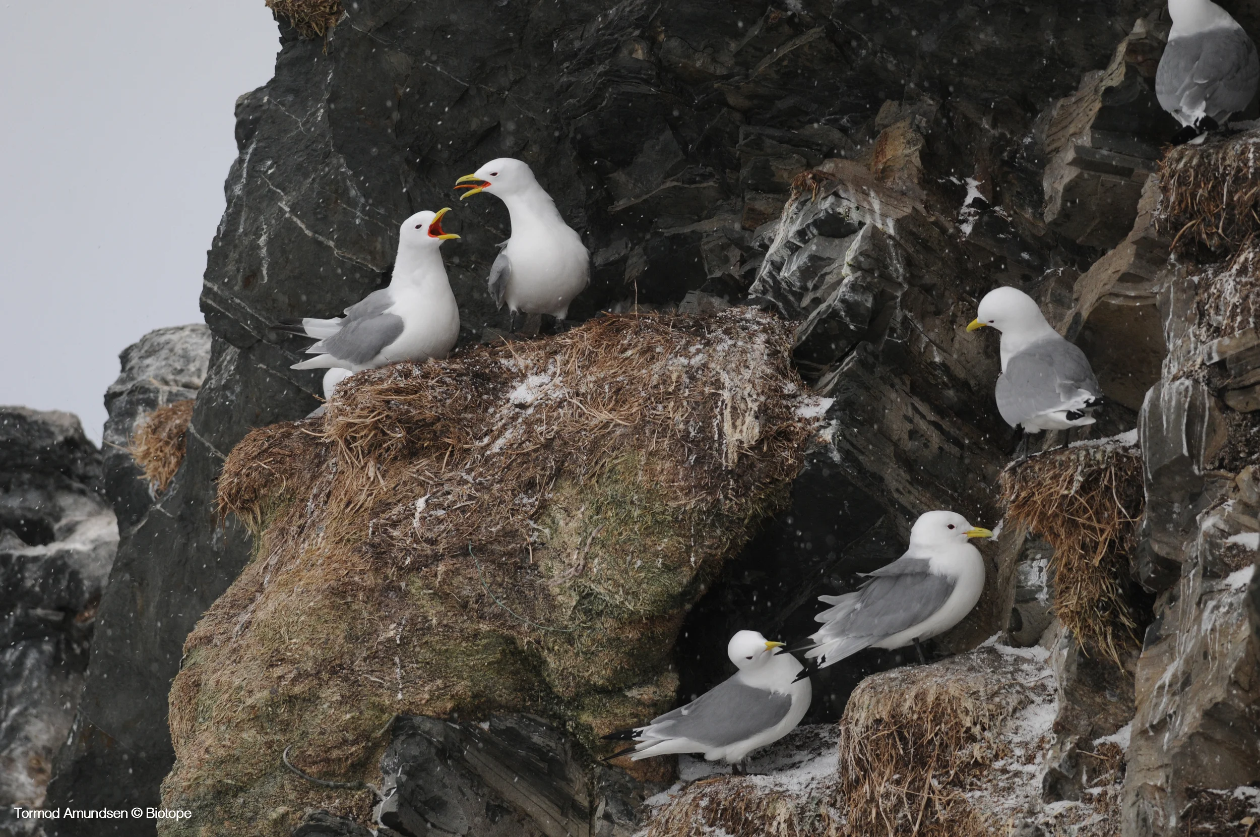 The Glaucous Gulls on Hornøya are visitors from the Russian tundra, where they breed. They resemble Herring Gulls, but have white wing tips. Glaucous Gulls are most commonly seen on the island from autumn through to spring, though some individuals remain in Varanger all year round. Large numbers of gulls build up on Hornøya in April before their migration back to Siberia. They are fearsome predators of smaller birds, chasing puffins and kittiwakes. They are also opportunists, feeding on animal carcasses, human waste and discarded fish in harbours across Varanger.