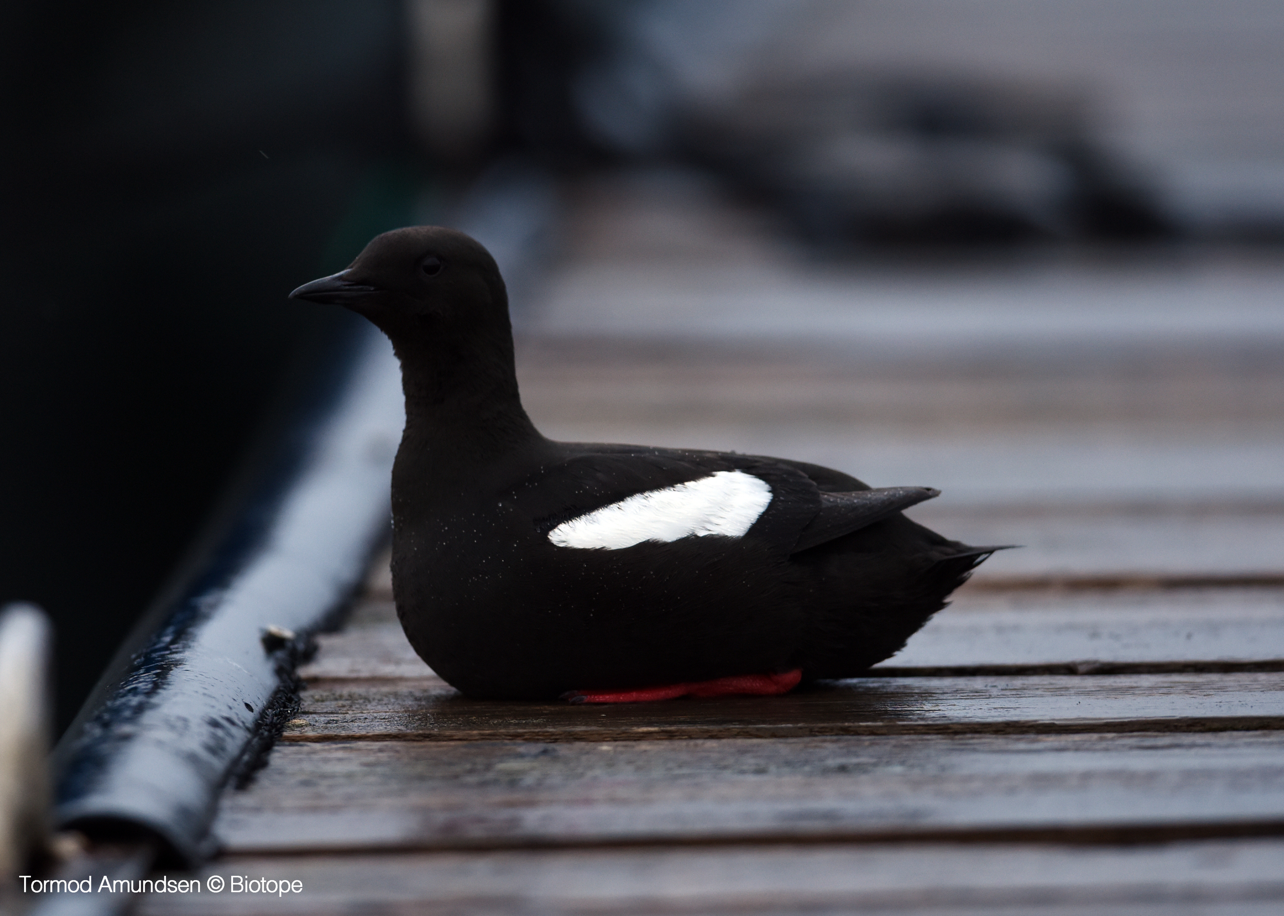 One of the smaller seabirds you are likely to see around Hornøya. They are distinctive birds, with an all-black body, white wing patches and bright red feet. Black Guillemots breed in crevices lower down on the cliffs than other auks. They too dive underwater for their prey, specialising in hunting the elongated Rock Gunnel or Butterfish. This fish is generally found close to the coast, meaning Black Guillemots do not typically forage far from land.