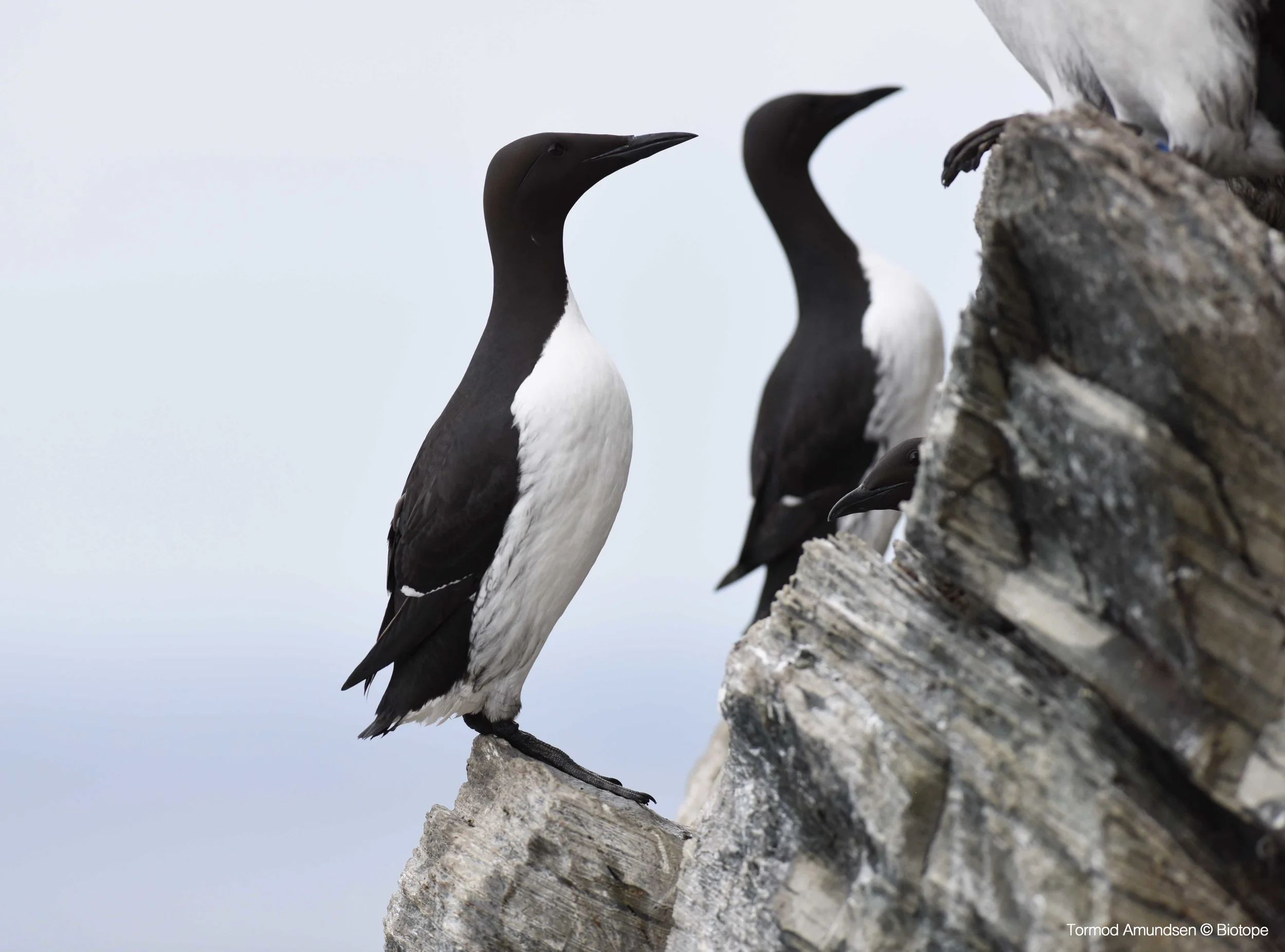 The Common Guillemot is the most numerous bird on Hornøya, with 15 000 breeding pairs. While clumsy on land, and not especially graceful in flight, under the water is where they excel. Using their wings like flippers, the guillemots glide through the water to hunt fish. They mainly feed on capelin, herring and young cod. The population of guillemots here crashed during the 1980s, when fish stocks were extremely low, but they have since made a recovery. In fact, contrary to many of the other guillemot colonies in Norway, the Honøya colony is still increasing and has since risen above the pre-collapse numbers.