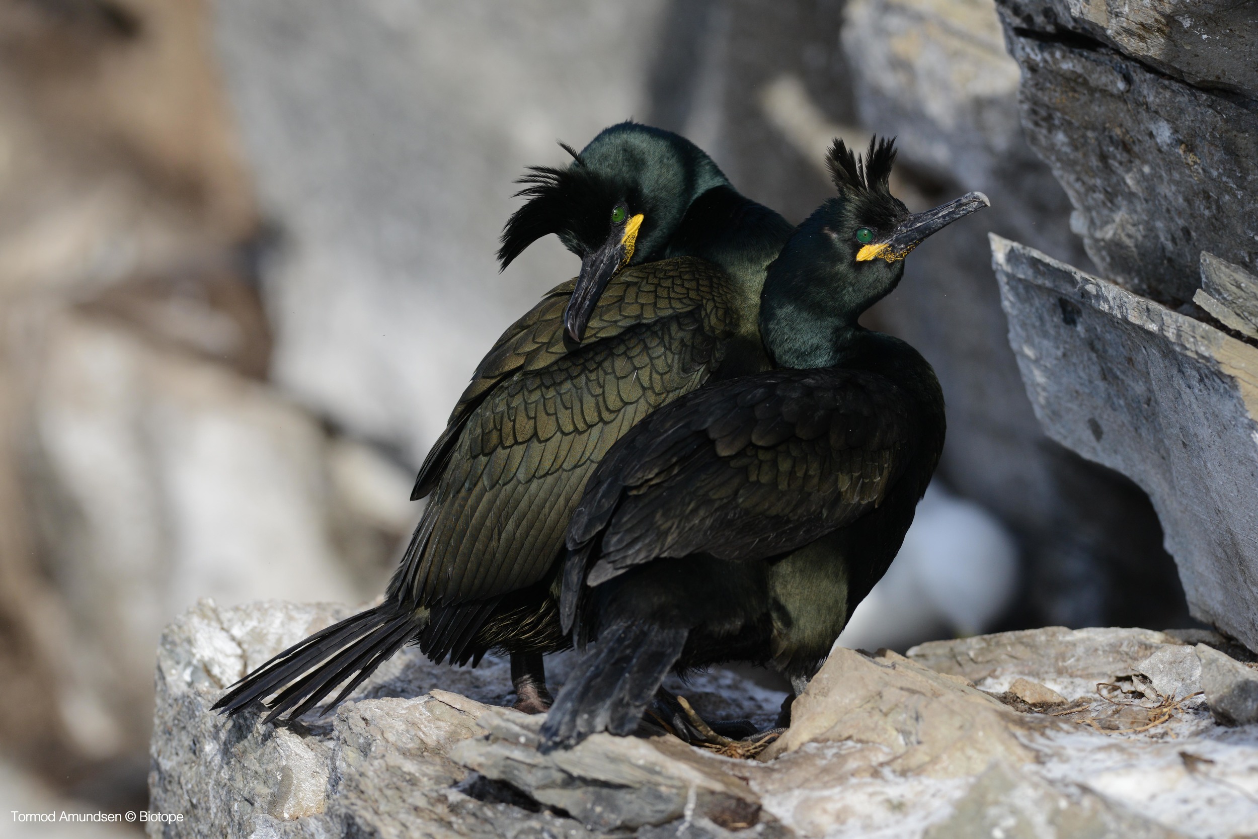 Great Cormorants do not actually breed on Hornøya but they are common in the surrounding area, often seen perched on rocks with their wings held outstretched to dry their feathers. The Great Cormorants of Arctic Norway are of particular interest to ornithologists, who claim that the cormorants here are genetically separate from the European subspecies carbo and sinensis. It is thought the cormorants here are more closely related to the Japanese Cormorant Phalocrocorax capillatus and should become a new subspecies: norvegicus.