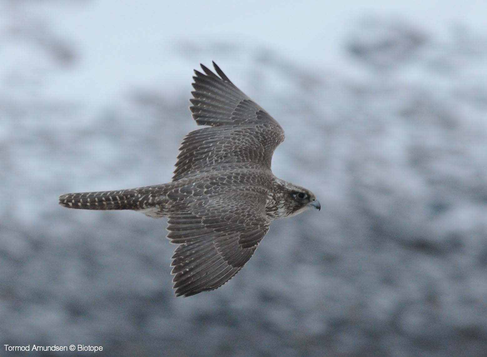 Gyrfalcons, the largest falcon in the world, do not breed on Hornøya but regularly visit the island to hunt. The cliffs here provide an abundance of prey for them. Young kittiwakes are particularly easy targets. The presence of a Gyrfalcon is usually indicated by sheer pandemonium on the cliff, with birds scattering in all directions. Ravens and larger gulls do not tolerate the falcons, and attempt to chase them away from the colony. Away from Hornøya, Gyrfalcons mainly hunt grouse. Gyrfalcons breed on the mainland, nesting on cliff faces or in old raven nests.
