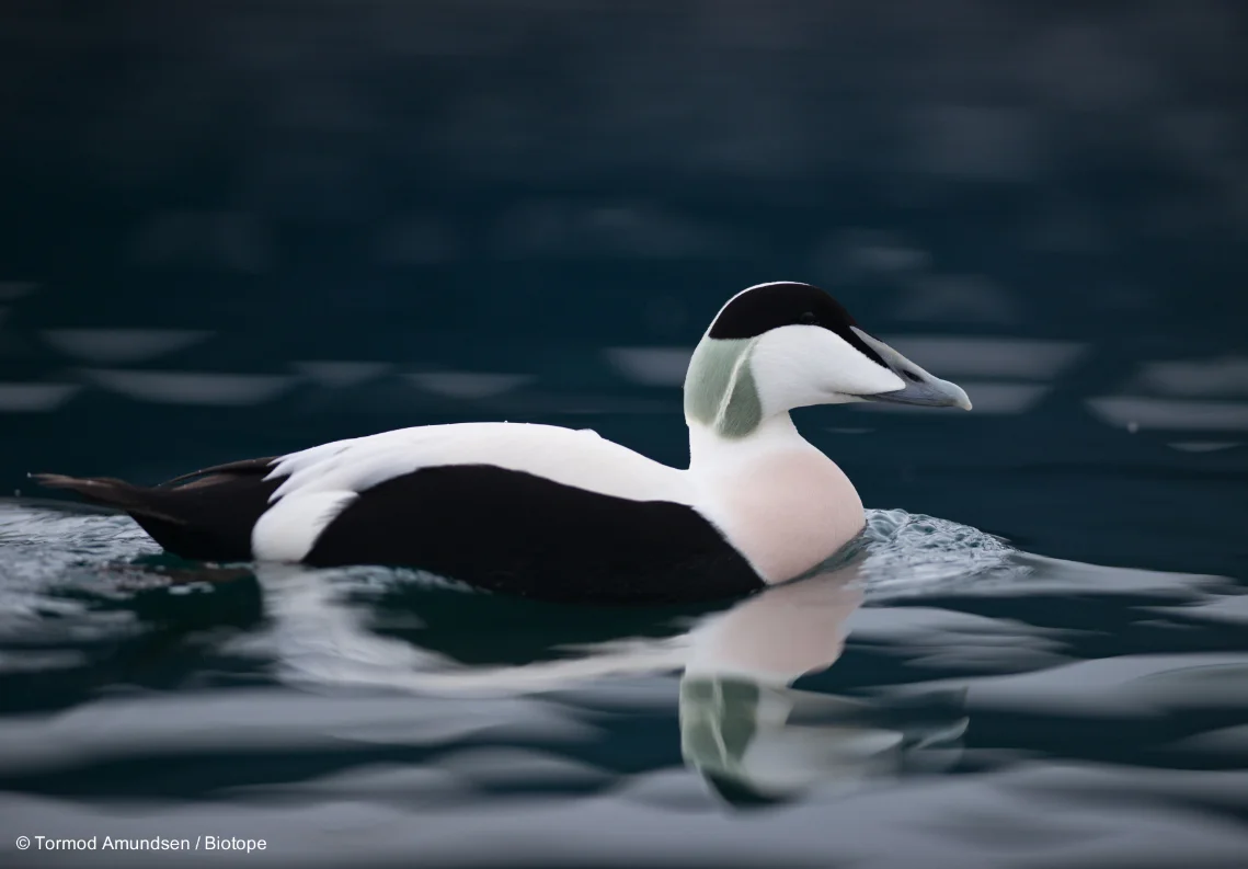 Common Eiders are present all year around Hornøya. Small numbers breed among the vegetation cover on the island in the summer. While sitting on the nest, female eiders pluck soft feathers from their chests to line their nest. The feathers have tiny barbs which hook into one another and create a light, airy ‘duvet ’which retains heat. Eiders dive underwater to find shellfish such as mussels and urchins. In February and March, Common Eiders congregate in huge numbers around Hornøya and Vardøya. Many of these birds will have come from Siberia.