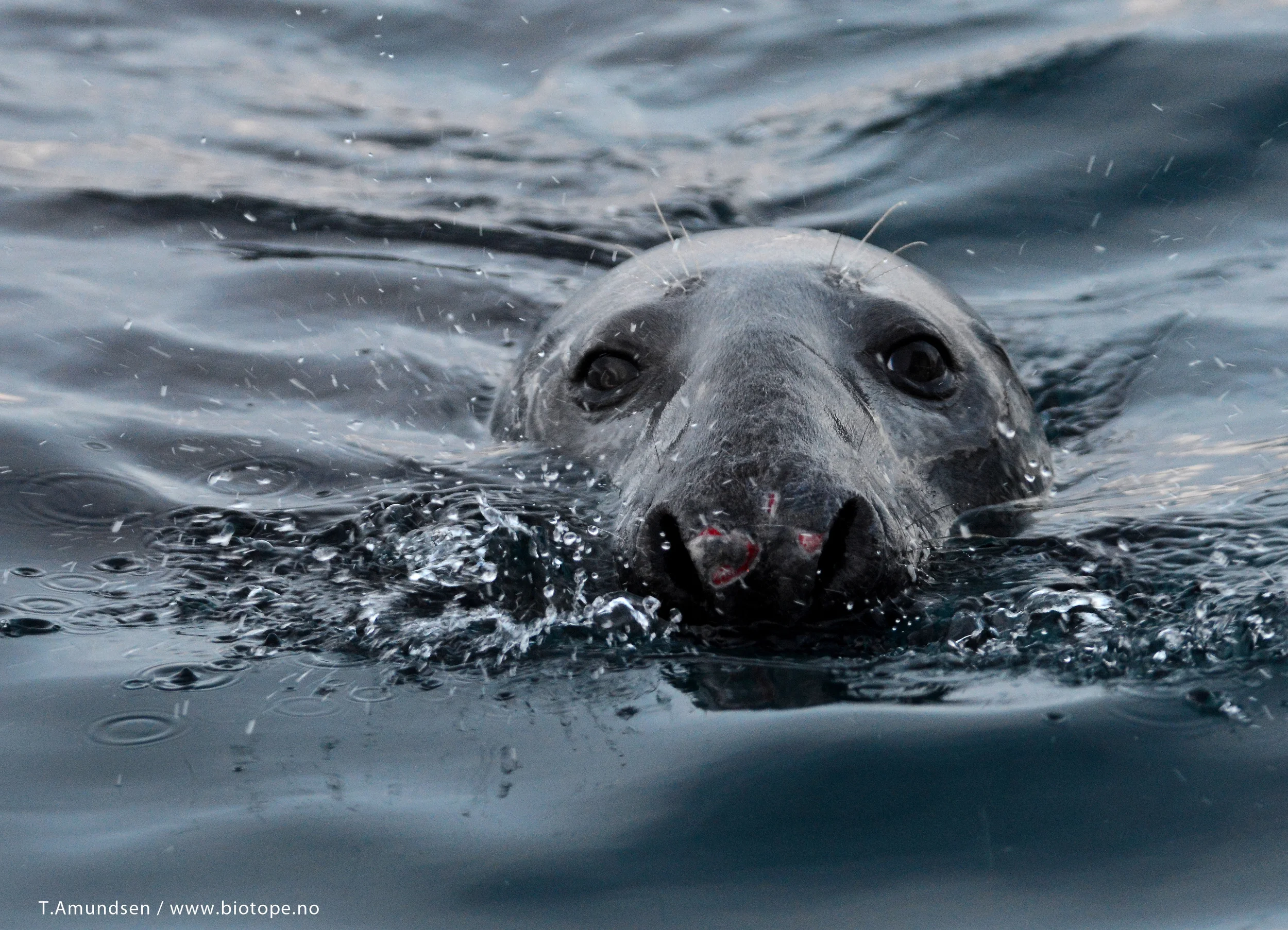 Grey Seals are common in the waters around Hornøya. They are frequently seen in Vardø harbour too, where they feed on fish scraps discarded from the factories. A small colony of seals exists on Reinøyskjær, a rocky island off Hornøya. Young seals are born with a covering of white fur to keep them warm. They gain blubber fast by feeding on the fatty milk produced by their mothers. Eventually some will grow to become huge male seals, reaching 400kg in weight. Varanger occasionally hosts Bearded Seals and even Walruses too, both visitors from the far north. It is worth checking any seals swimming around Hornøya for these rare visitors.
